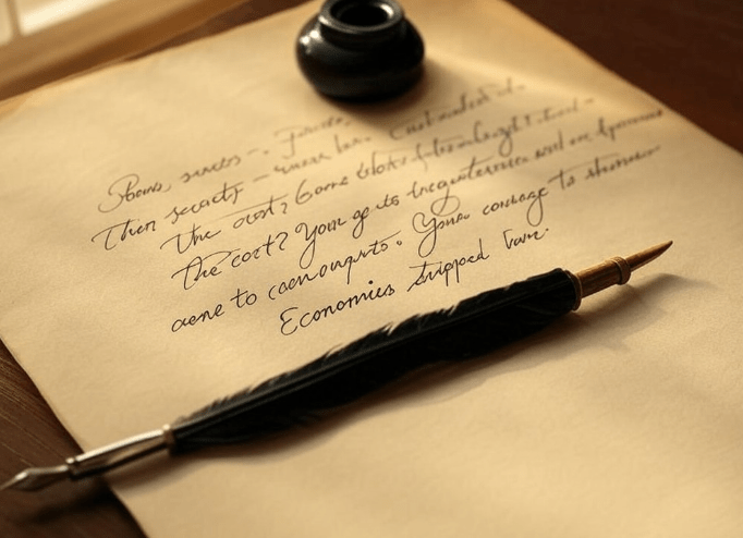 Poems, secrets—same deal, The cost? Your courage to share. Economics stripped bare, Trading on old, worn coin.